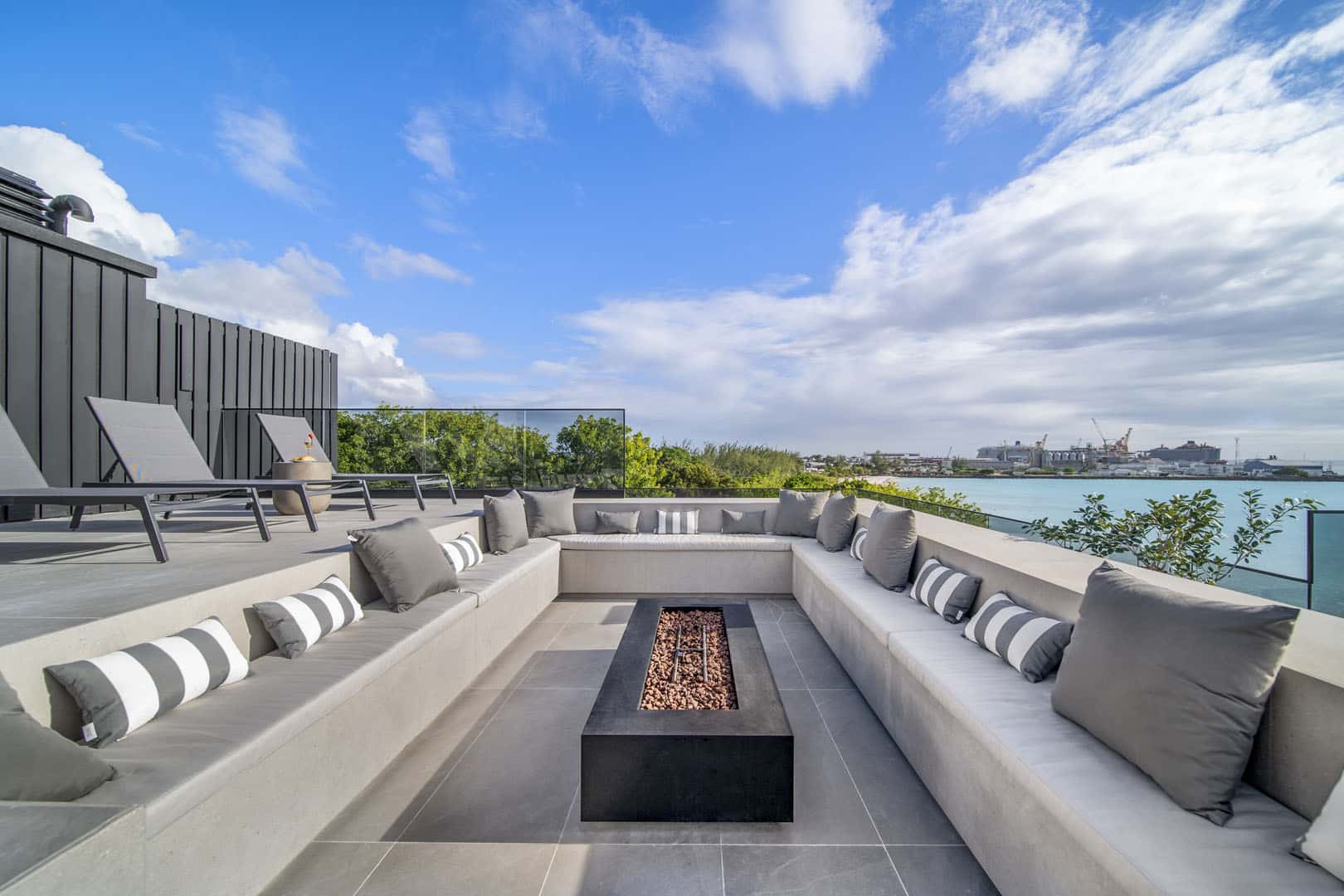 Step inside the open-plan living area, where sleek, contemporary furnishings complement stunning panoramic sea views. The spacious layout is designed for both comfort and style, with bespoke décor and smart home technology that makes for an effortless living experience. The fully equipped kitchen features premium appliances and a breakfast bar, perfect for preparing island-inspired meals. A convenient powder room adds to the home's practicality.