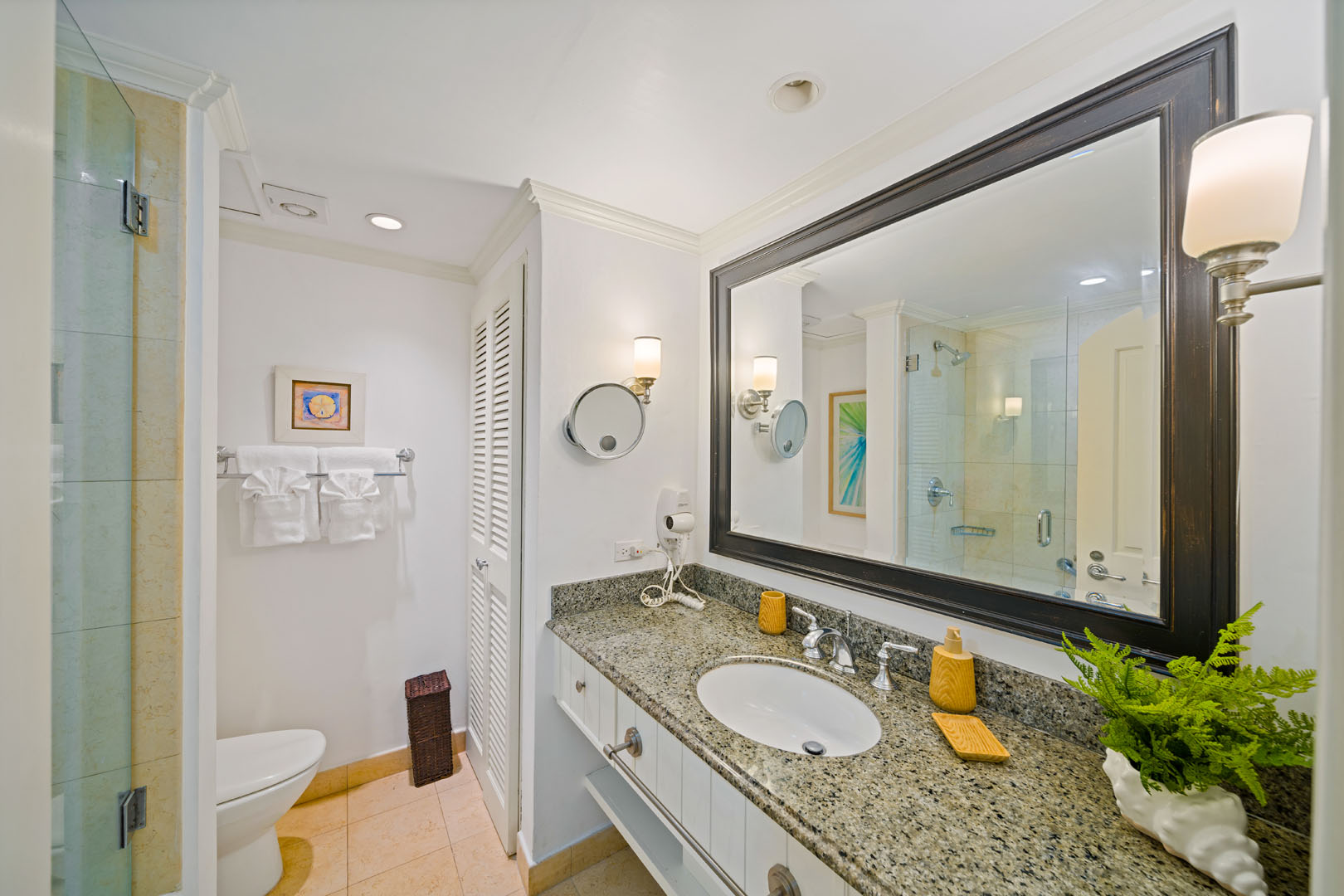 Both bedrooms are thoughtfully styled, with the primary bedroom offering an ensuite bathroom for privacy and comfort. Soft décor, clean lines, and a calm colour palette create an atmosphere that’s cosy without feeling heavy. It’s a home that invites rest after beach days and island exploring.