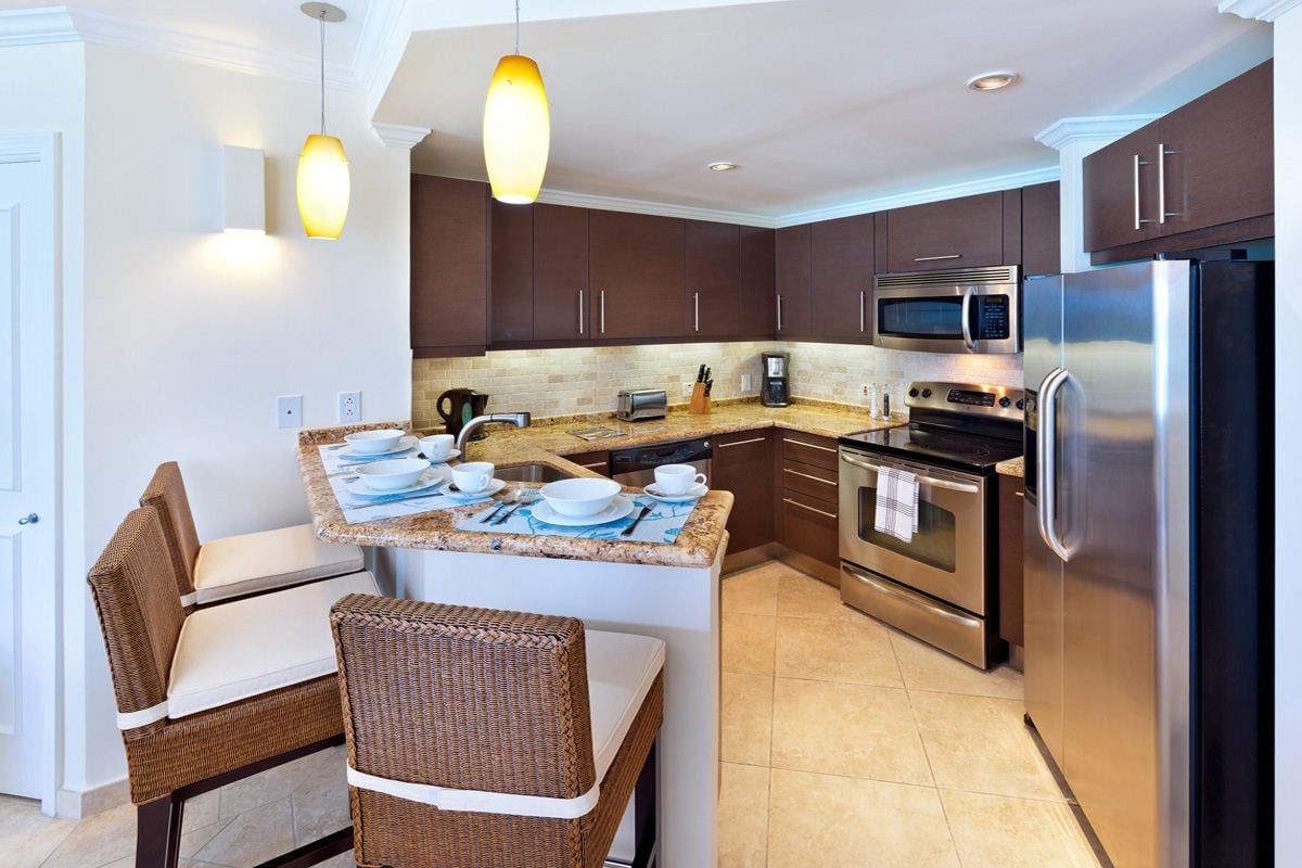 The master bedroom is en suite with a king-size bed and furnished with pops of ocean blues and a fabulous sliding door with vistas out to the Caribbean Sea! The second bedroom also has a king bed and an en suite bathroom with dual vanities. Twin beds furnish the third bedroom, with a third bathroom conveniently adjacent. All rooms are air-conditioned with ceiling fans.