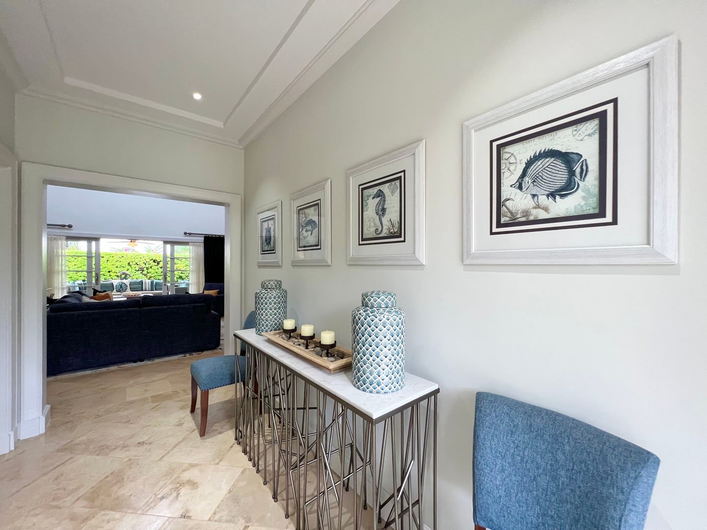 Inside, the villa is designed with a modern yet cosy feel, featuring blue and tan tones that reflect the relaxed island lifestyle. The open-plan living space includes tall ceilings, air conditioning, and ceiling fans, creating a comfortable setting for unwinding after a day in the sun.